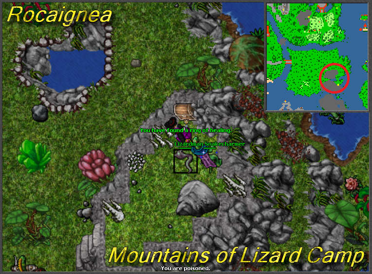 You can reach this area by starting from the south exit of Nova and going southeast, crossing an old bridge. You will find a small jungle with some weak creatures like snakes or bugs, and then you will see some mountains with lizards.
